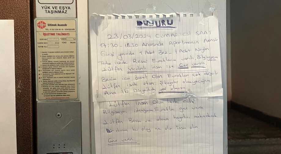 Eskişehir’de yaşayan ve muhasebeci Filiz Şen, geçtiğimiz cumartesi günü İbrahim Karaoğlanoğlu Caddesi üzerindeki evine oğluyla geldi. Elindeki maliyeti 1 milyon TL olan evrakları apartman girişindeki asansörün yanında unutup markete gitti. Yarım saat sonra marketten dönen Şen ve oğlu evrakları yerinde bulamadı. Mağdur olan Şen, eşyasını alan şahıslara o evrakların işlerine yarayamayacağını söyleyerek geri getirmeleri için seslendi.