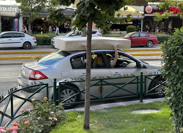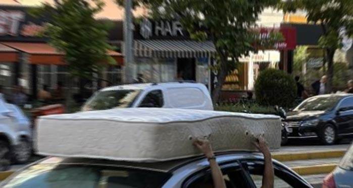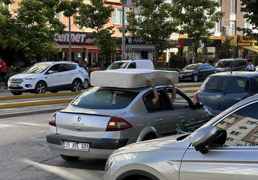 Otomobile sığmayan yatağı elleriyle taşımakta zorlanan gençler, çareyi arabanın tavanında buldu. Yatağı arabanın tavanına koyan ve ellerini camdan çıkararak yatağı tutan öğrencileri görenler şaşkınlığını gizleyemedi.