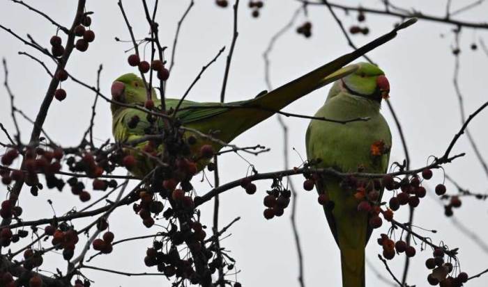 Eskişehir'in Tepebaşı ilçesinde bir süredir aynı parkta görülen ve ağaçlardaki meyvelerle beslenen papağanlar, çevre sakinlerinin ilgisini çekti.