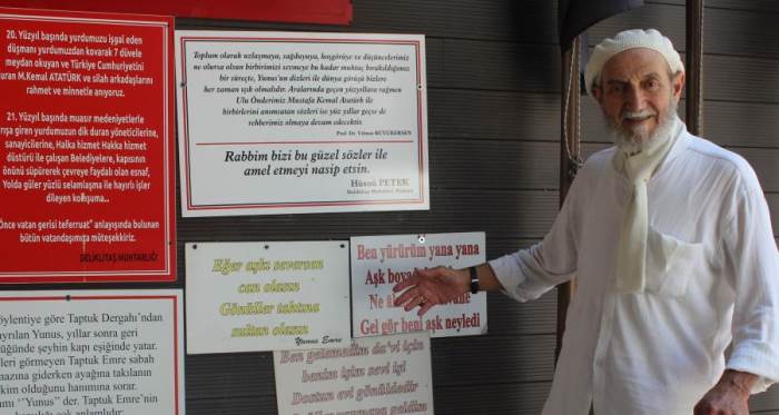 79 yaşındaki muhtar Petek, Eskişehirli olan Yunus Emre’ye sevgisini onun değerli özlü sözlerini asarak gösteriyor. Muhtarlık önünden geçen vatandaşlar da duvardaki özlü sözleri okuyarak ufuklarını genişletiyor.