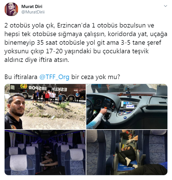 haklisin REİS Ama bizim yönetimde suç yokmu? Pırlanta gibi çocuklarımıza otobüste eziyet çektirene kadar uçak bileti alsalardı. ama yapmadılar yapamadılar. Paraları yok. Paraları yoksa orada durmasınlar..... Bu gençlere yazık. Yabancı oyuncular olsaydı takımda ne yapıp edip inan bilet alınırdı. Yeri geldiğinde bizim çocuklarımız diyorlar ya Ama bunlar bizim çocuklarımız fark etmez....