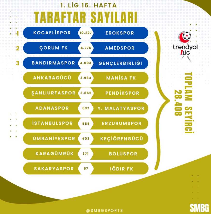 Eskişehirspor'un bu müthiş taraftar desteği, 1. Lig takımlarının seyirci sayılarına da büyük bir fark attı. 1. Lig'in 16. haftasında oynanan maçlarda, seyirci sayıları şu şekildeydi: