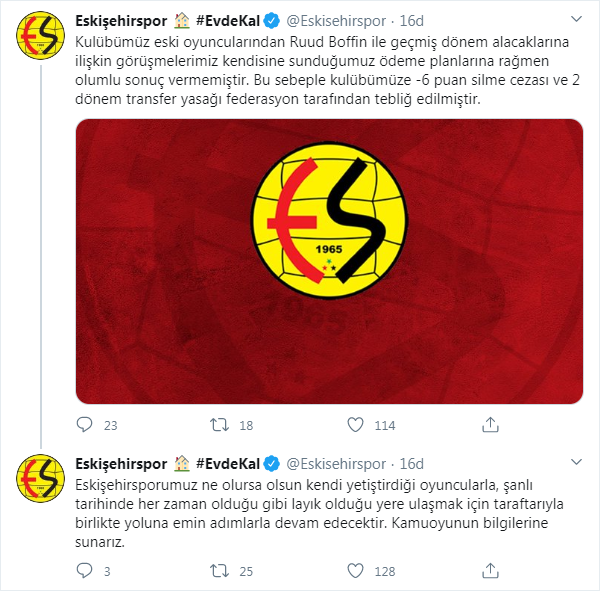 Bu ceza zaten gelmiş veya geleceği kesin biliniyordu.Alıştıra alıştıra söylenmeye çalışıldı.Bu yönetim takımı amatöre kadar götürmeye gelmiş. Hiçbir şey yapamadılar............ Uyan artık millet ..Zor durumda bile yabancı oyuncu acımıyor. Boffin'i kaptanlık verip EsEs çektiriyorduk. Ne oldu..Acımıda..Bir de EsEs düşmanı avukatları var.Türk oyuncuların da alacağı var.Türk oyuncular ve teknik direktörler bunu asla yapmadı.