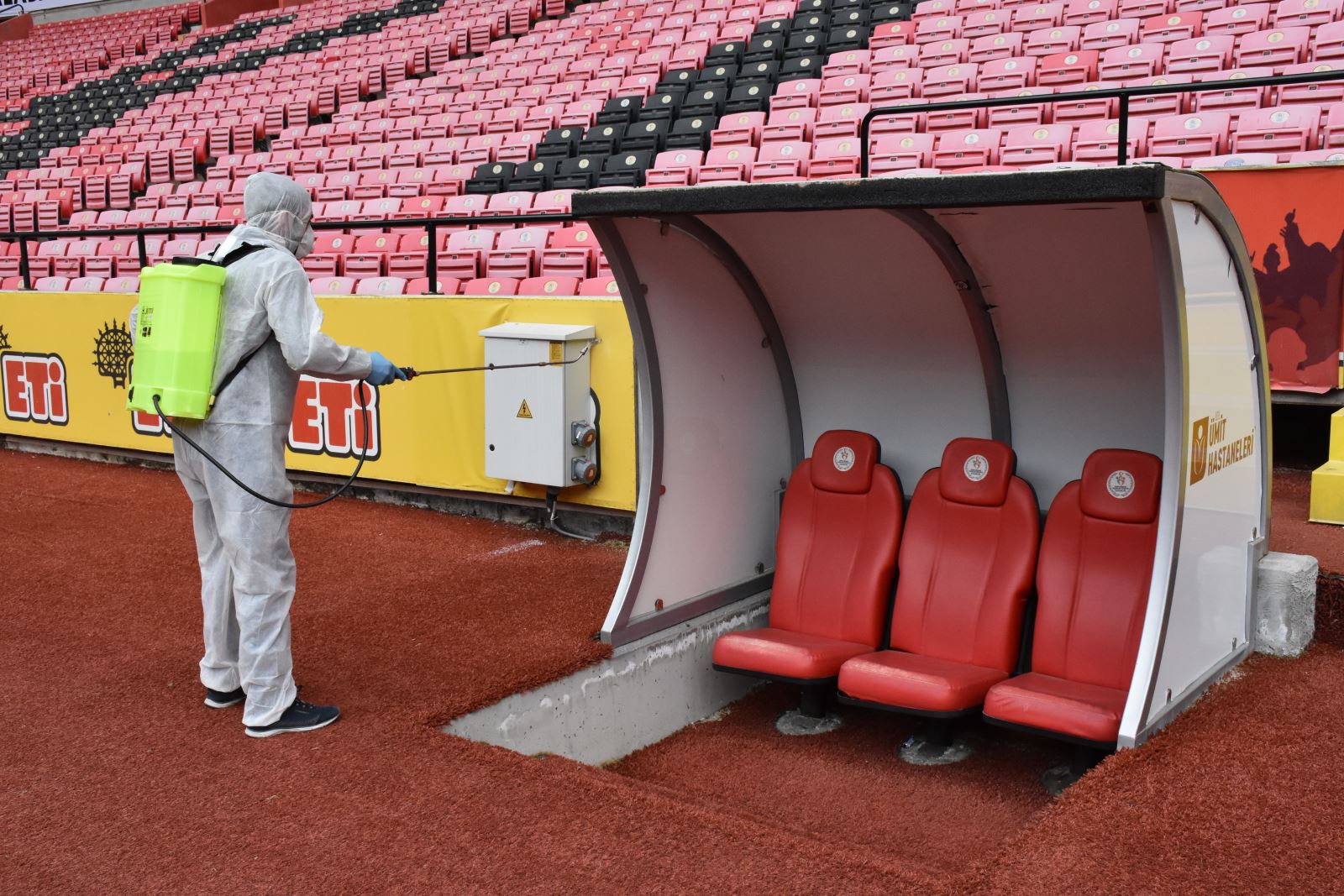 Eskişehirspor-Adana Demirspor müsabakası öncesinde Eskişehir Gençlik ve Spor İl Müdürlüğü tarafından korona virüse karşı tedbir olarak stadyum ilaçlandı