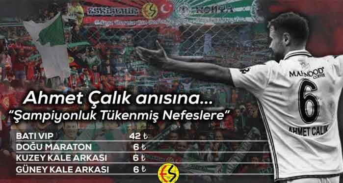 Eskişehirspor yönetimi taraftarların yoğun isteği üzerine Pazar günü oynanacak olan Karacabey Belediyespor karşılaşmasının bilet fiyatlarını Ahmet Çalık anısına değiştirdi. Yönetimden yapılan açıklamada şu ifadelere yer verildi; “Taraftarımızın talebi üzerine “Ahmet Çalık” anısına Pazar günü oynayacağımız Karacabey Belediyespor maçı biletleri 6 TL, VIP tribünü biletleri ise 42 TL olarak belirlendi. Bu hafta tükenmiş tüm nefesler anısına her zamanki yerimizdeyiz!”