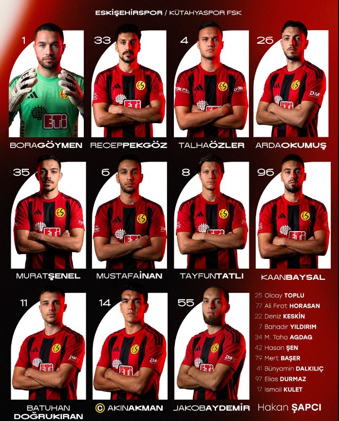 Teknik heyet, zorlu deplasmanda sahaya dengeli ve mücadele gücü yüksek bir kadro sürmeyi tercih etti. Eskişehirspor’un ilk 11’i şu şekilde: Bora Göymen, Recep Pekgöz, Murat Şenel, Talha Özler, Arda Okumuş, Mustafa İnan, Tayfun Tatlı, Kaan Baysal, Akın Akman, Batuhan Doğrukıran ve Christopher Jakob Aydemir.