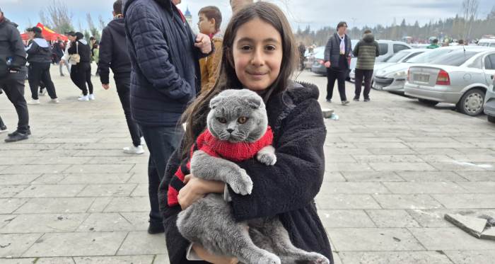 “Bizimle birlikte maçı takip edecek” diyen Arife Masal Sarıtaş, “Kedimin ismi Varil, kendisi 1 yaşında. Çok uyumlu bir kedi olduğu için onu da maça getirdik. Bizimle birlikte maçı takip edecek, tribüne çıkacağız. Hiç tırmalamıyor, kaçmaya çalışmıyor” ifadelerini kullandı.