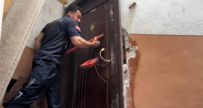 Bursa’da kiracısını çıkarmak isteyen ev sahibi içeride bulunan ailenin üzerine kapıyı kilitledi. Saatlerce evde mahsur kalan aileyi kurtarmak için gelen itfaiye ve polis ekibinin çelik kapıyı kırması kolay olmadı. Balyozun kırıldığı, kapının kırılmadığı kurtarma operasyonu kameraya yansırken, çelik kapı krikoyla açıldı.