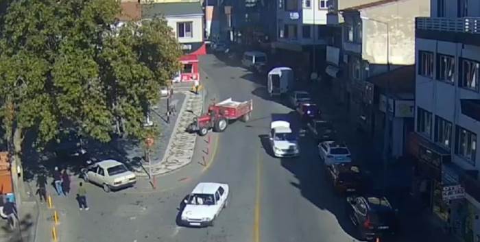 Kayseri'nin Develi ilçesinde, freni patlayan bir traktör kontrolden çıkarak önce iki araca, ardından da kaldırıma çıkarak yayaların arasına daldı.
