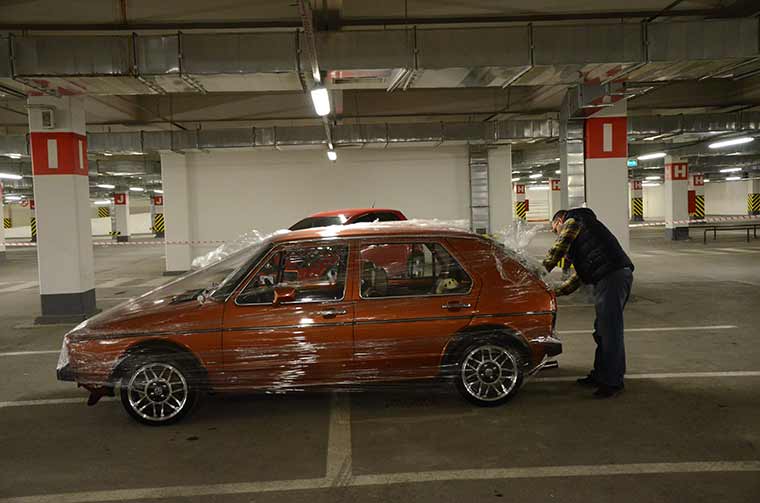 Eskişehir'de yaşayan Kerem Doğan isimli vatandaş, iz kalmaması için otomobilini her park ettiğinde streç film ile sarıyor.
