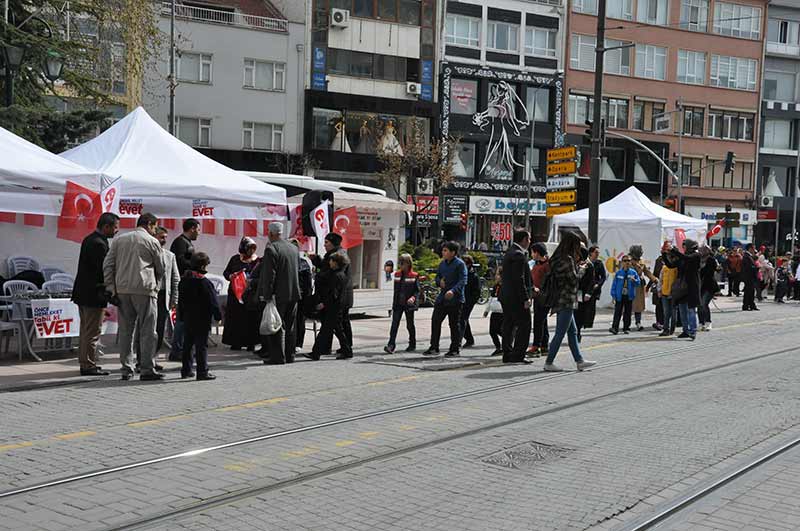 Eskişehir'de halk oylamasına yönelik kampanyalarını aynı caddede beş metre arayla kurdukları çadırda yürüten farklı görüşteki siyasi partiler, vatandaşlara anayasa değişikliğine ilişkin görüşlerini aktarıyor.