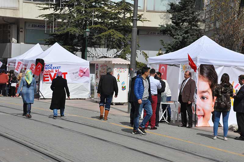 Eskişehir'de halk oylamasına yönelik kampanyalarını aynı caddede beş metre arayla kurdukları çadırda yürüten farklı görüşteki siyasi partiler, vatandaşlara anayasa değişikliğine ilişkin görüşlerini aktarıyor.