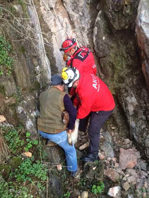 Keçinin bulunduğu noktaya yukarıdan ip tekniklerini kullanarak ulaşan özel eğitimli ekip, mahsur kalan hayvanı perlonlarla bağlayarak emniyetli bir şekilde güvenli alana indirdi.