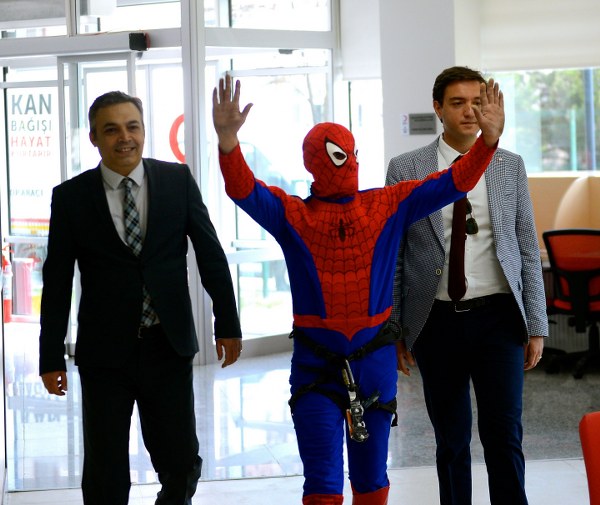 Yüksek binaların dış cephe temizliğini yaparak geçimini sağlayan "Örümcek Adam" lakaplı Tamer Uysal, kan bağışının önemine dikkati çekmek için çatısına tırmandığı Türk Kızılay Eskişehir Bölge Kan Merkezi'ne pencereden girip kan verdi.