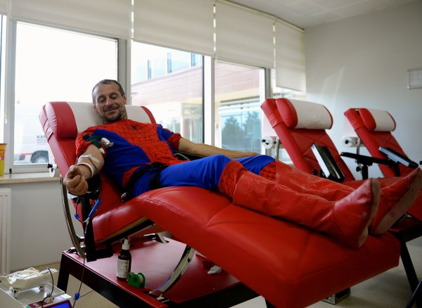 Yüksek binaların dış cephe temizliğini yaparak geçimini sağlayan "Örümcek Adam" lakaplı Tamer Uysal, kan bağışının önemine dikkati çekmek için çatısına tırmandığı Türk Kızılay Eskişehir Bölge Kan Merkezi'ne pencereden girip kan verdi.