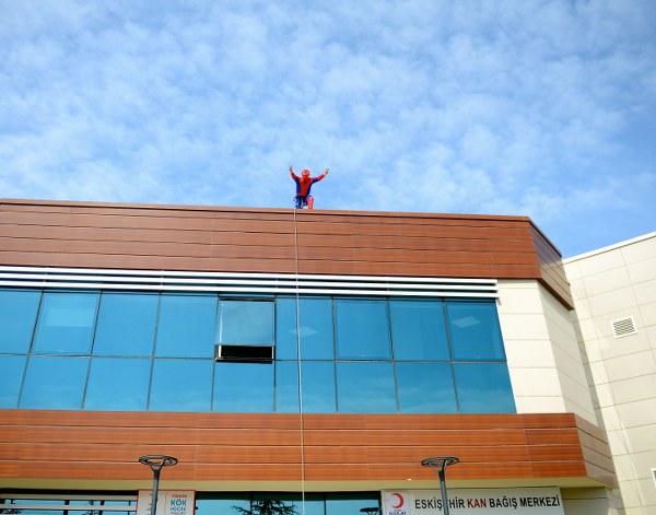 Yüksek binaların dış cephe temizliğini yaparak geçimini sağlayan "Örümcek Adam" lakaplı Tamer Uysal, kan bağışının önemine dikkati çekmek için çatısına tırmandığı Türk Kızılay Eskişehir Bölge Kan Merkezi'ne pencereden girip kan verdi.