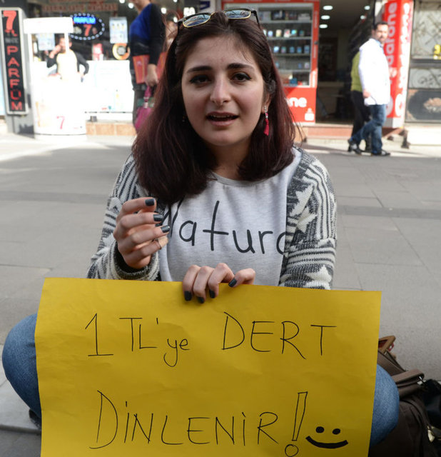 Uşak Üniversitesi öğrencisi iki kız arkadaş, kentin işlek caddelerinden birinde "1 TL'ye dert dinlenir" yazısıyla "müşteri" çekmeye ve talep edenlerin derdine derman olmaya çalışıyor.