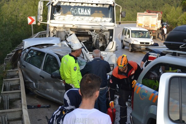 2 TIR'ın arasında kalan otomobil hurdaya döndü