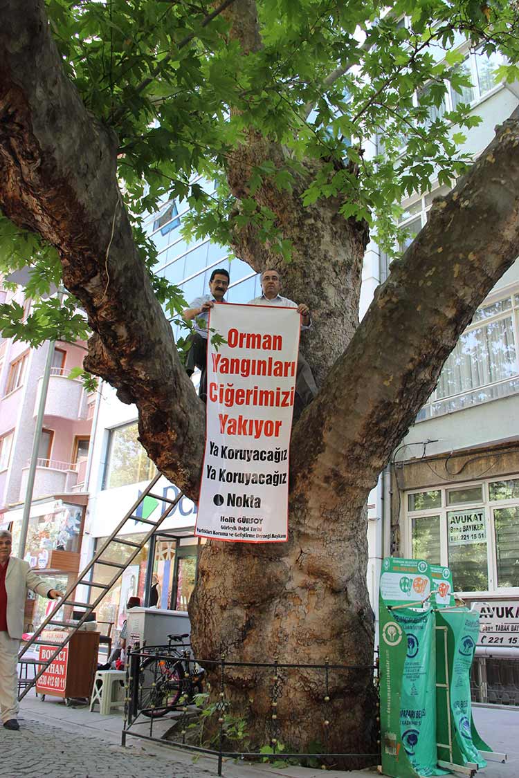 Eskişehir Gürleyik Doğal ve Tarihi Varlıkları Koruma ve Geliştirme Derneği Başkanı Halit Gürsoy, orman yangınlarına dikkat çekmek amacı ile 202 yıllık koca çınara çıkarak tepkisini dile getirdi.