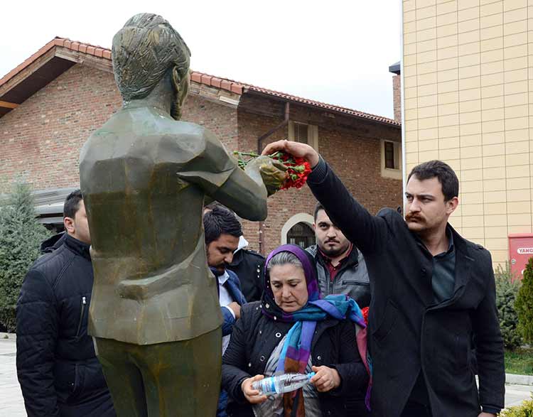 Gezi olayları sırasında Eskişehir’de hayatını kaybeden Ali İsmail Korkmaz’ın annesi Emel Korkmaz ile babası Şahap Korkmaz, düzenlenecek bir etkinliğe katılmak üzere geldikleri Eskişehir’de oğullarının heykeline karanfil bıraktı.