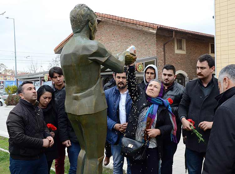 Gezi olayları sırasında Eskişehir’de hayatını kaybeden Ali İsmail Korkmaz’ın annesi Emel Korkmaz ile babası Şahap Korkmaz, düzenlenecek bir etkinliğe katılmak üzere geldikleri Eskişehir’de oğullarının heykeline karanfil bıraktı.