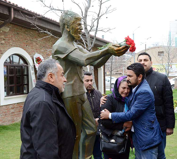 Gezi olayları sırasında Eskişehir’de hayatını kaybeden Ali İsmail Korkmaz’ın annesi Emel Korkmaz ile babası Şahap Korkmaz, düzenlenecek bir etkinliğe katılmak üzere geldikleri Eskişehir’de oğullarının heykeline karanfil bıraktı.
