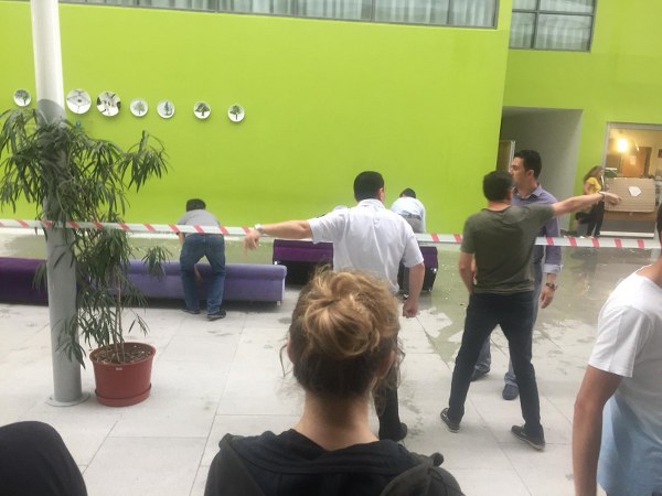 Çatıdan sızan sular tahliye edilirken kısa sürede bakım ve onarım çalışmalarına başlandı.