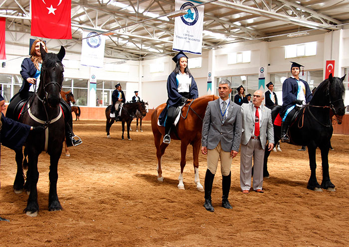 Eskişehir Osmangazi Üniversitesi (ESOGÜ) Mahmudiye Meslek Yüksekokulu Atçılık ve Antrenörlüğü Bölümündeki öğrenciler, atların üstünde kep atarak mezun oldu.