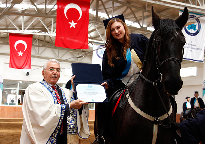 Eskişehir Osmangazi Üniversitesi (ESOGÜ) Mahmudiye Meslek Yüksekokulu Atçılık ve Antrenörlüğü Bölümündeki öğrenciler, atların üstünde kep atarak mezun oldu.
