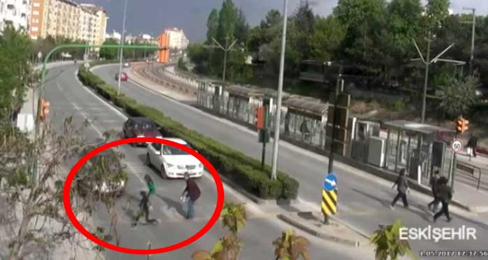 Eskişehir’de, iki çocuğu ile yolun karşısına geçmekte olan babanın yanından fırlayan bir çocuğuna otomobil çarpması MOBESE kameraları tarafından saniye saniye kaydedildi.