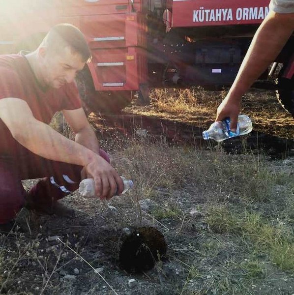Kütahya’nın Hisarcık ilçesinde çıkan anız yangını sonrasında itfaiye şoförü ve işçi çavuşunun, baş kısmındaki okların ucunda yanık bulunan kirpiyi su dökerek soğutmaları herkesin içini ısıttı.
