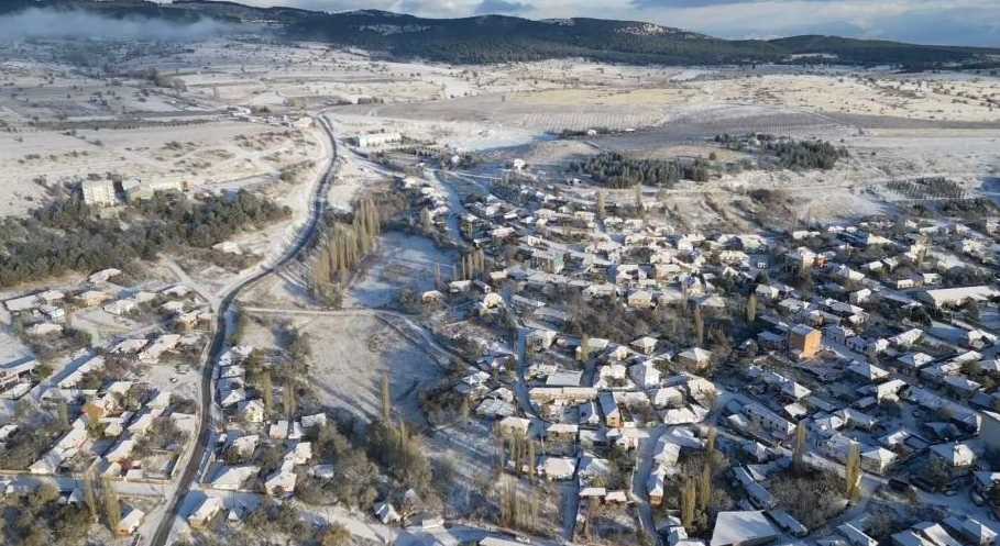 Bir hafta aradan sonra yeniden yağan karla beyaza bürünen Mihalıççık dron ile havadan görüntülenirken ortaya kartpostallık manzaralar çıktı.
