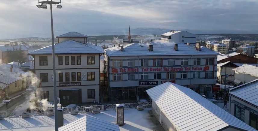Bir hafta aradan sonra yeniden yağan karla beyaza bürünen Mihalıççık dron ile havadan görüntülenirken ortaya kartpostallık manzaralar çıktı.