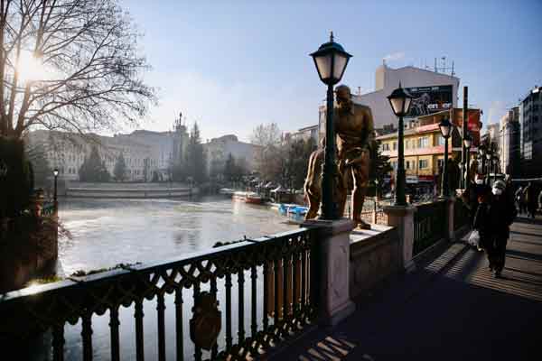 Eskişehir kent merkezinden geçen Porsuk Çayı'nın yüzeyi soğuk hava nedeniyle buz tuttu.