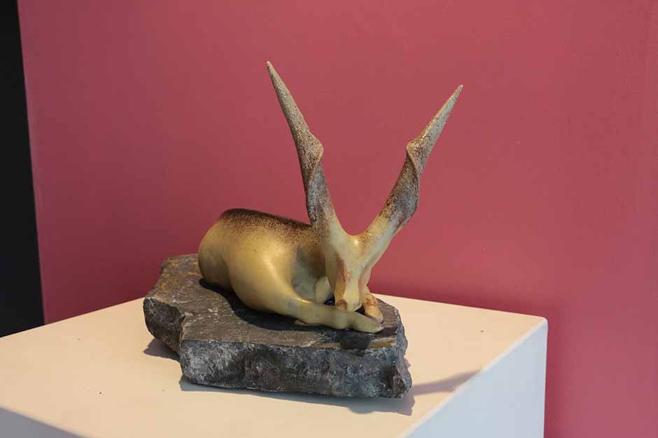 Seramik sanatçısı Ayşe Ergüner, bazı hayvanların boynuzu ve dişleri için avlanmasına tepkisini göstermek için fil, geyik, keçi ve gergedan başta olmak üzere boynuzlu hayvanların seramik heykellerini yapıyor.