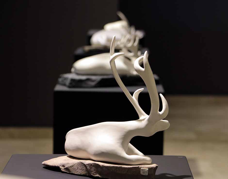 Seramik sanatçısı Ayşe Ergüner, bazı hayvanların boynuzu ve dişleri için avlanmasına tepkisini göstermek için fil, geyik, keçi ve gergedan başta olmak üzere boynuzlu hayvanların seramik heykellerini yapıyor.