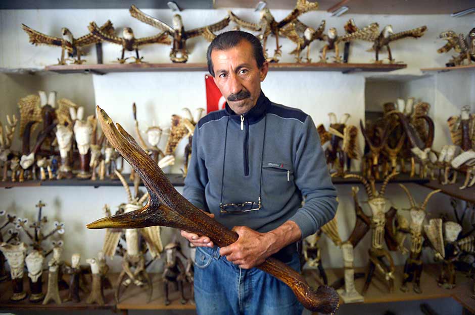Eskişehir'in Mihalıççık ilçesi Ilıcalar Mahallesi Muhtarı Yurttaş Ayaş, 1999 yılından beri geyik boynuzundan kartal, yılan, ejderha gibi birçok figürün heykelini yapıyor.