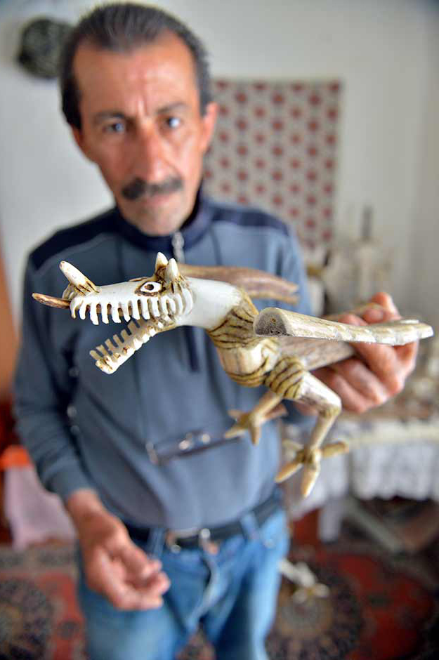 Eskişehir'in Mihalıççık ilçesi Ilıcalar Mahallesi Muhtarı Yurttaş Ayaş, 1999 yılından beri geyik boynuzundan kartal, yılan, ejderha gibi birçok figürün heykelini yapıyor.