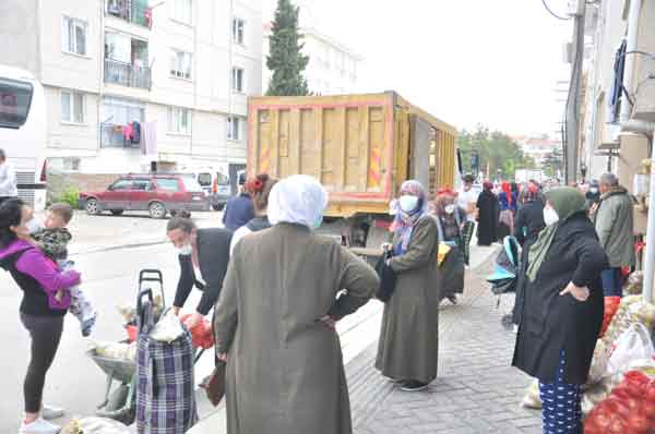 Sabah erken saatlerde patates, soğan alma umuduyla kamyonun önünde bekleyen vatandaşların bir kısmı bebek arabasıyla bir kısmı da el arabasıyla geldi.