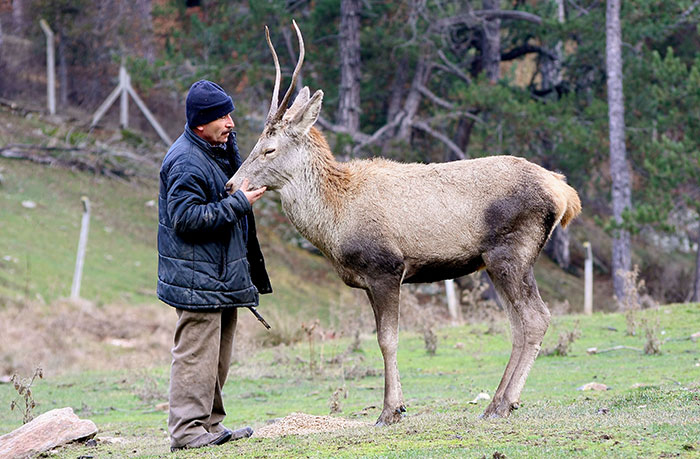 Eskişehir'in Mihalıççık ilçesindeki Doğa Koruma ve Milli Parklar Genel Müdürlüğüne ait Çatacık Kızıl Geyik Üretme ve Gen İstasyonunda görevli Zekeriya Soğuk, geyiklerle kurduğu yakın iletişimle görenlerin ilgisini çekiyor.