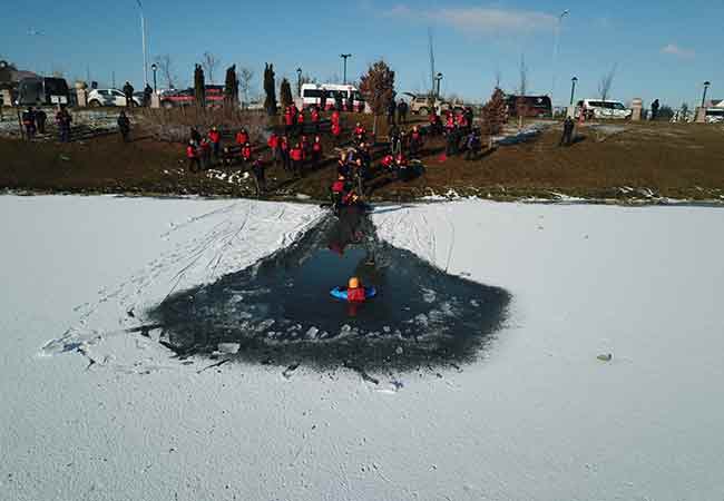 Eskişehir'de, İl Afet ve Acil Durum Müdürlüğü (AFAD) tarafından, akarsu, göl ve barajlarda oluşan buzun üzerinde yürümenin güvenli olmadığı konusunda farkındalık oluşturmak ve buz kazalarının önlenmesi amacıyla tatbikat gerçekleştirildi.