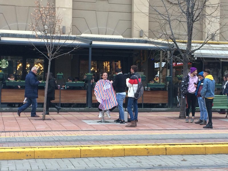 Soğuk havaya aldırış etmeden cadde ortasında saç tıraşını olan Demir, işini bitirdikten sonra etrafını toparlayarak gözden kayboldu.