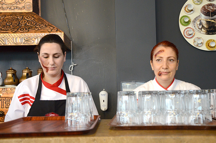 Ayten Usta Gurme Restaurant çalışanları, 8 Mart Dünya Kadınlar Günü nedeniyle yüzlerine yaptırdıkları makyajlar ile kadına şiddete dikkat çekti.