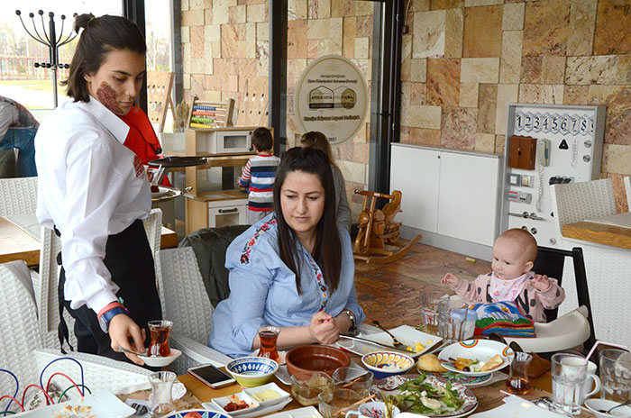 Ayten Usta Gurme Restaurant çalışanları, 8 Mart Dünya Kadınlar Günü nedeniyle yüzlerine yaptırdıkları makyajlar ile kadına şiddete dikkat çekti.