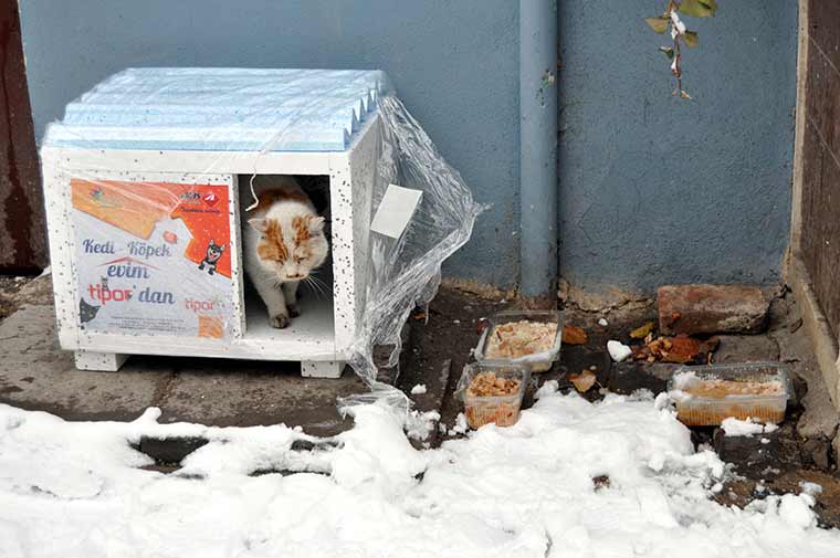 Eskişehir'de, sosyal medya aracılığıyla bir araya gelen Düş Bahçesi Çocukları Topluluğu üyeleri, kış mevsiminde sokak kedilerinin barınması amacıyla kentte belirlediklere alanlara "kedi evleri" yerleştiriyor.