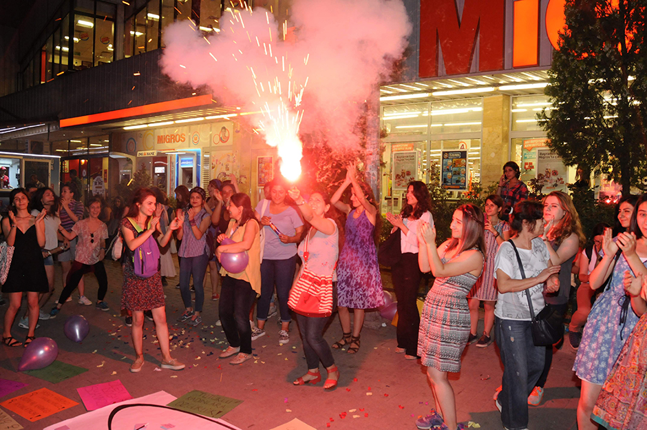 Eskişehir Demokratik Kadın Platformu (EDKP) üyeleri, eşini öldürdüğü gerekçesiyle tutuklanan Çilem Doğan’ın beraatini meşale yakıp kutladı.