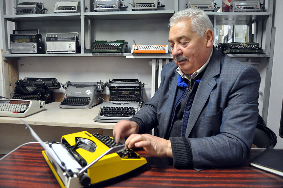 Eskişehir'de emekli bankacı 70 yaşındaki Hamdi Yücesoy, biri 125 yıllık 30 daktilodan oluşan koleksiyonunu, onarım yaptığı iş yerinde sergiliyor.