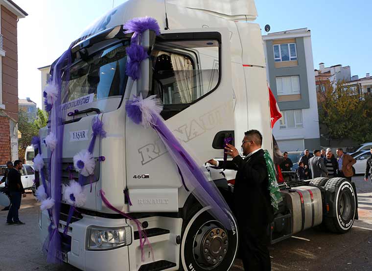 Eskişehir'de şoförlük yapan damat, kullandığı tırı "gelin arabası" yaptı.