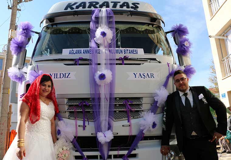 Eskişehir'de şoförlük yapan damat, kullandığı tırı "gelin arabası" yaptı.