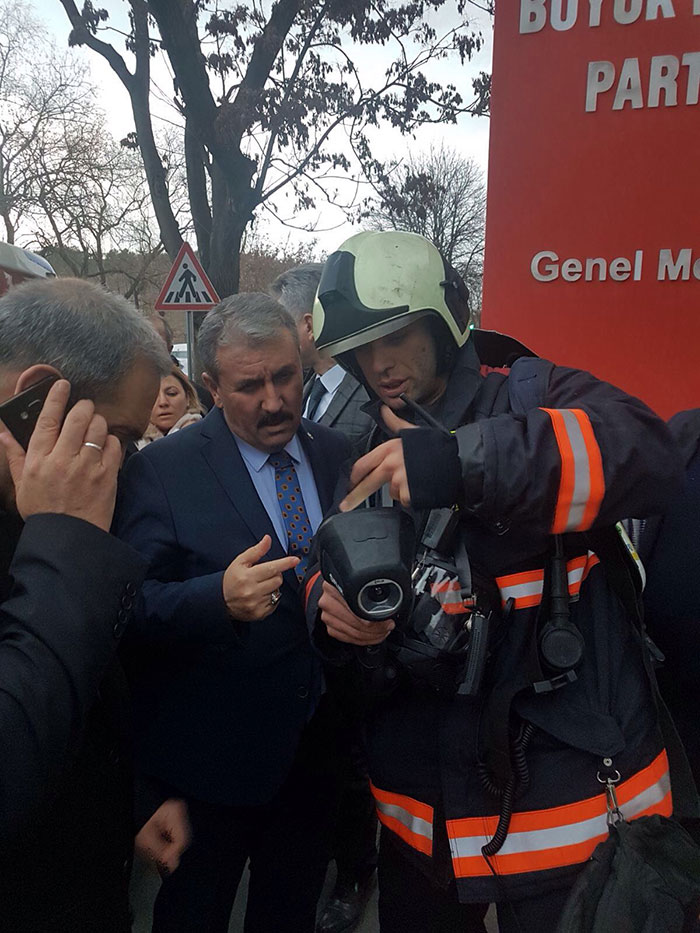 Büyük Birlik Partisi (BBP) Genel Başkanı Mustafa Destici, dün makam odasındaki klimanın patlaması sonucu meydana geldiği değerlendirilen yangında zarar gören yerleri inceledi.